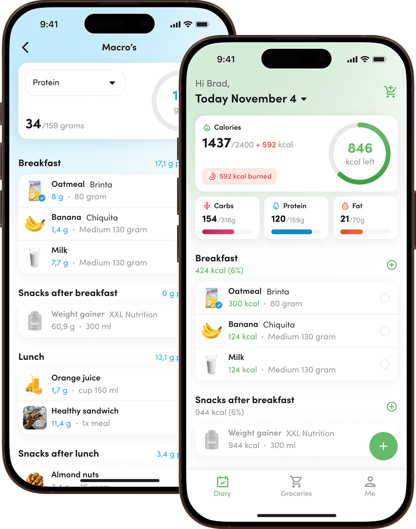 Virtuagym Food: Helping you to live healthy and feel great. Get a free personalized nutrition plan by answering a few questions about your lifestyle and goals. We support plans for many goals: weight loss, maintaining weight, weight gain and building muscle. Eat what you want, but keep an eye on those calories, carbs and fats!